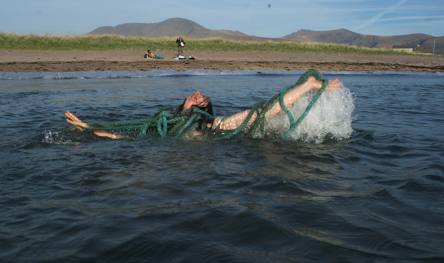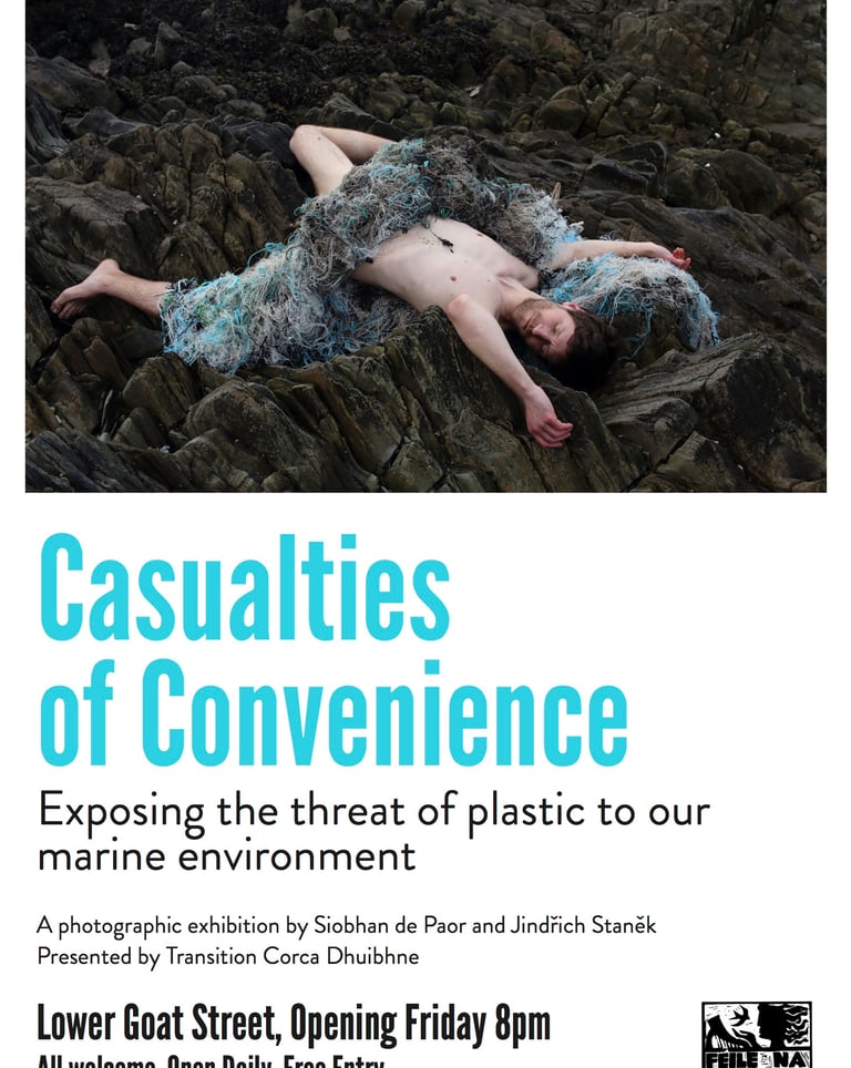 Fourteen volunteers from Transition Corca Dhuibhne posed nude for this exhibition to highlight the threat of plastic pollution to the marine environment. The exhibition first showed on Goat Street during Féile na Bealtaine and was later hung in an Lab, Amharclann Gaeilge for the month of June.